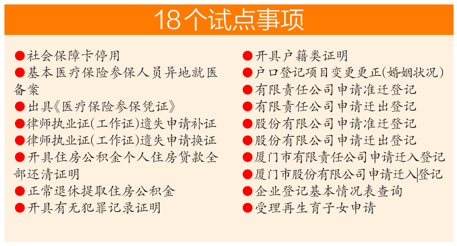 按照以往的做法,在異地工作和生活的人,辦事得在戶籍地和工作地之間來回跑。今起,廈門市各行政服務(wù)中心等辦事窗口即可受理試點(diǎn)事項(xiàng)異地辦理申請。試點(diǎn)工作圍繞醫(yī)療、社保、公安、商事登記等重點(diǎn)領(lǐng)域,首批梳理了包括社會保障卡停用、律師執(zhí)業(yè)證(就業(yè)證)遺失申請補(bǔ)證和換證、戶籍類證明、再生育子女證明等18項(xiàng)高頻個(gè)人和企業(yè)事項(xiàng)。
