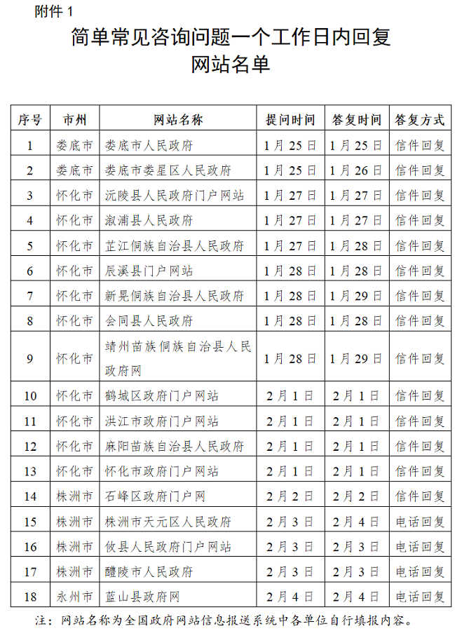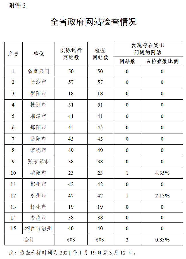 2021年第一季度,省政務(wù)局組織對(duì)全省正常運(yùn)行的603家政府網(wǎng)站進(jìn)行全覆蓋檢查,發(fā)現(xiàn)2家存在問(wèn)題,總體合格率99.67%,其中長(zhǎng)沙市、衡陽(yáng)市、株洲市、湘潭市、邵陽(yáng)市、岳陽(yáng)市、常德市、張家界市、郴州市、懷化市、婁底市、湘西自治州網(wǎng)站檢查合格率100%。重點(diǎn)檢查了全省136家政府門戶網(wǎng)站互動(dòng)交流功能,懷化市、株洲市、婁底市、永州市共有18家政府門戶網(wǎng)站實(shí)現(xiàn)了對(duì)簡(jiǎn)單常見咨詢問(wèn)題1個(gè)工作日內(nèi)準(zhǔn)確答復(fù)(詳見附表1)。對(duì)全省正常運(yùn)行的2269家政務(wù)新媒體進(jìn)行普查,發(fā)現(xiàn)17家存在問(wèn)題,總體合格率99.25%,其中衡陽(yáng)市、湘潭市、岳陽(yáng)市、常德市、郴州市、永州市、懷化市、婁底市、湘西自治州政務(wù)新媒體檢查合格率100%。