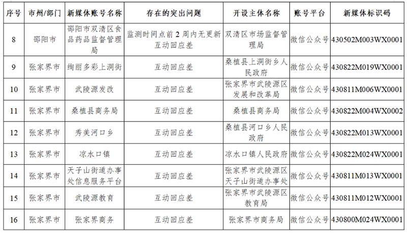 (三)政務(wù)新媒體運(yùn)維管理仍需規(guī)范。本季度檢查共有17家政務(wù)新媒體存在突出問(wèn)題,9家互動(dòng)回應(yīng)差,其中張家界市“武陵源發(fā)改”、“涼水口鎮(zhèn)”微信公眾號(hào)在2020年四季度被通報(bào)互動(dòng)回應(yīng)差問(wèn)題后整改不及時(shí),本季度檢查問(wèn)題仍然存在;9家政務(wù)新媒體監(jiān)測(cè)時(shí)間點(diǎn)前2周內(nèi)無(wú)更新,其中“邵陽(yáng)市雙清區(qū)食品藥品監(jiān)督管理局”微信公眾號(hào)自2018年9月后未進(jìn)行更新,長(zhǎng)期處于“睡眠”狀態(tài)。