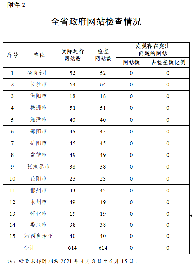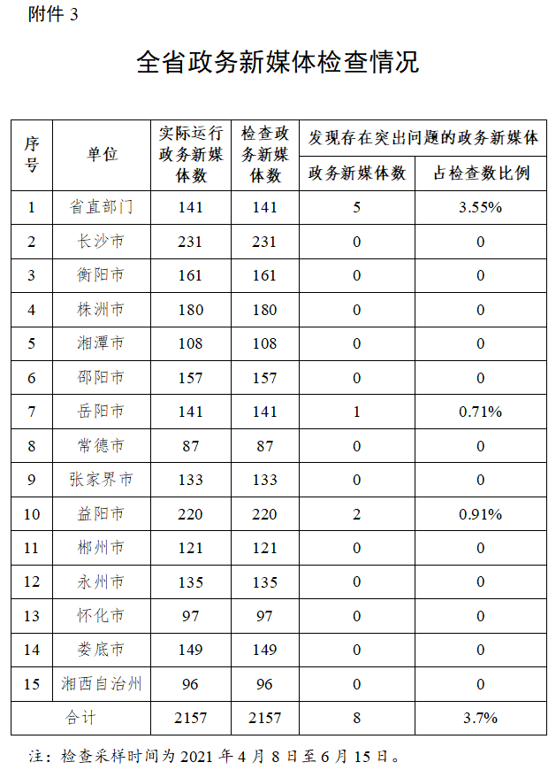 2021年第二季度,省政務(wù)局組織對全省正常運行的614家政府網(wǎng)站進行全覆蓋檢查,無存在突出問題政府網(wǎng)站,總體檢查合格率100%。重點檢查了50家省直單位網(wǎng)站互動交流功能,其中省長信箱欄目有32家單位、部門直通車欄目有20家單位實現(xiàn)了對簡單常見咨詢問題1個工作日內(nèi)準確答復(詳見附表1)。對全省正常運行的2157家政務(wù)新媒體進行普查,發(fā)現(xiàn)8家存在單項否決問題,總體合格率99.63%,其中長沙市、衡陽市、株洲市、湘潭市、邵陽市、常德市、張家界市、郴州市、永州市、懷化市、婁底市、湘西自治州政務(wù)新媒體檢查合格率100%。