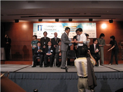圖片說(shuō)明2:主辦方香港生產(chǎn)力促進(jìn)局向深信服科技海外市場(chǎng)總監(jiān)Simon頒發(fā)榮譽(yù)獎(jiǎng)項(xiàng),同時(shí)獲獎(jiǎng)的還有Microsoft、IBM、Cisco、CA等公司。