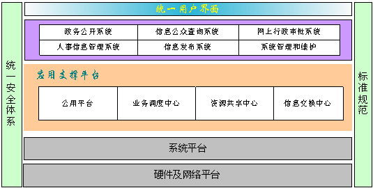 人事系統(tǒng)依托信息網(wǎng)絡(luò)平臺(tái),以應(yīng)用支撐平臺(tái)為核心,以安全和標(biāo)準(zhǔn)為保證。其中,統(tǒng)一安全體系和標(biāo)準(zhǔn)規(guī)范體系是貫穿整個(gè)系統(tǒng)的。如下圖所示: