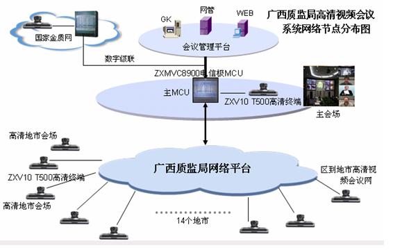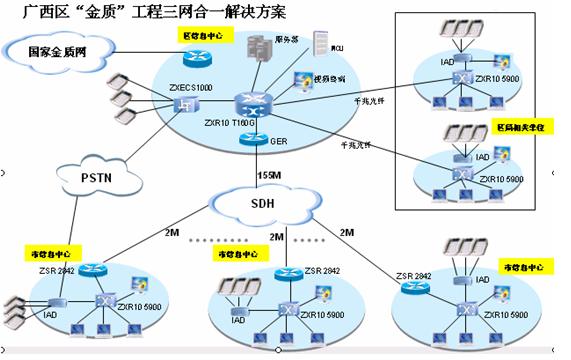 根據(jù)國家“金質(zhì)工程”五年規(guī)劃,結(jié)合廣西壯族自治區(qū)質(zhì)量技術(shù)監(jiān)督局實(shí)際情況,廣西“金質(zhì)工程”(一期)的建設(shè)目標(biāo)非常明確:以區(qū)質(zhì)監(jiān)局為核心,連接3個(gè)下屬研究院、14個(gè)地市質(zhì)監(jiān)局和1個(gè)產(chǎn)品質(zhì)監(jiān)院的質(zhì)監(jiān)業(yè)務(wù)專網(wǎng),支持?jǐn)?shù)據(jù)、語音和視頻業(yè)務(wù)的統(tǒng)一系統(tǒng)平臺(tái)。并以此平臺(tái)為基礎(chǔ),實(shí)現(xiàn)多業(yè)務(wù)的綜合接入,如質(zhì)監(jiān)信息的建立、管理、查詢,以及IP語音、視頻會(huì)議等。