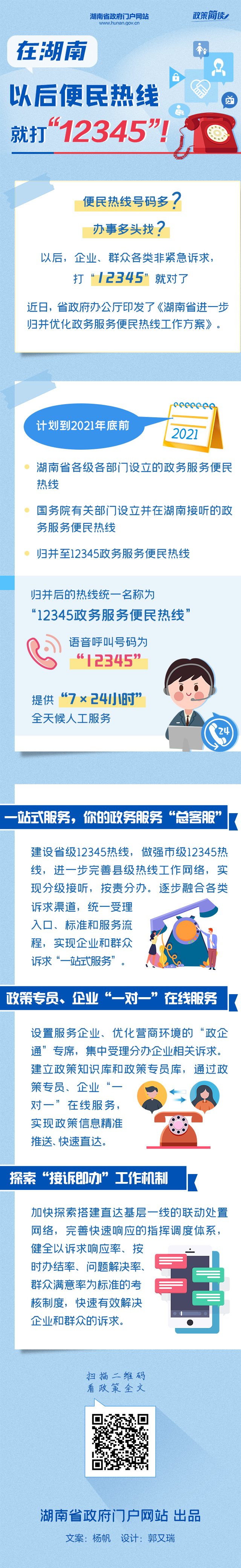 近日,省政府辦公廳印發(fā)《湖南省進一步歸并優(yōu)化政務(wù)服務(wù)便民熱線工作方案》(以下簡稱《方案》),提出要加快推進除110、119、120、122等緊急熱線外的政務(wù)服務(wù)便民熱線歸并。2021年底前,我省各級各部門設(shè)立的政務(wù)服務(wù)便民熱線以及國務(wù)院有關(guān)部門設(shè)立并在湖南接聽的政務(wù)服務(wù)便民熱線,歸并至“12345政務(wù)服務(wù)便民熱線”,語音呼叫號碼為“12345”,提供“7×24小時”全天候人工服務(wù)。同時,按照“統(tǒng)一規(guī)范、整體聯(lián)動、協(xié)同高效”的原則,優(yōu)化熱線運行管理機制,強化熱線服務(wù)支撐,確保企業(yè)和群眾反映的問題和合理訴求及時得到處置和辦理,使政務(wù)服務(wù)便民熱線接得更快、分得更準(zhǔn)、辦得更實,形成“一號對外、訴求匯總、分類處置、統(tǒng)一協(xié)調(diào)、各方聯(lián)動、限時辦結(jié)、評價考核”的工作機制,打造便捷、高效、規(guī)范、智慧的政務(wù)服務(wù)“總客服”。