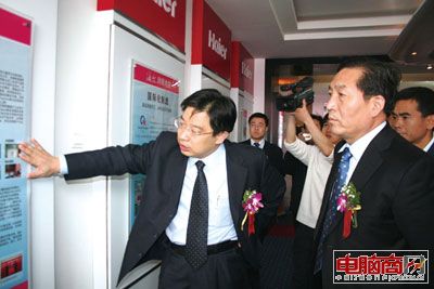 海爾信息科技總裁高以成(左)向當?shù)卣I導介紹海爾電腦的發(fā)展歷程。