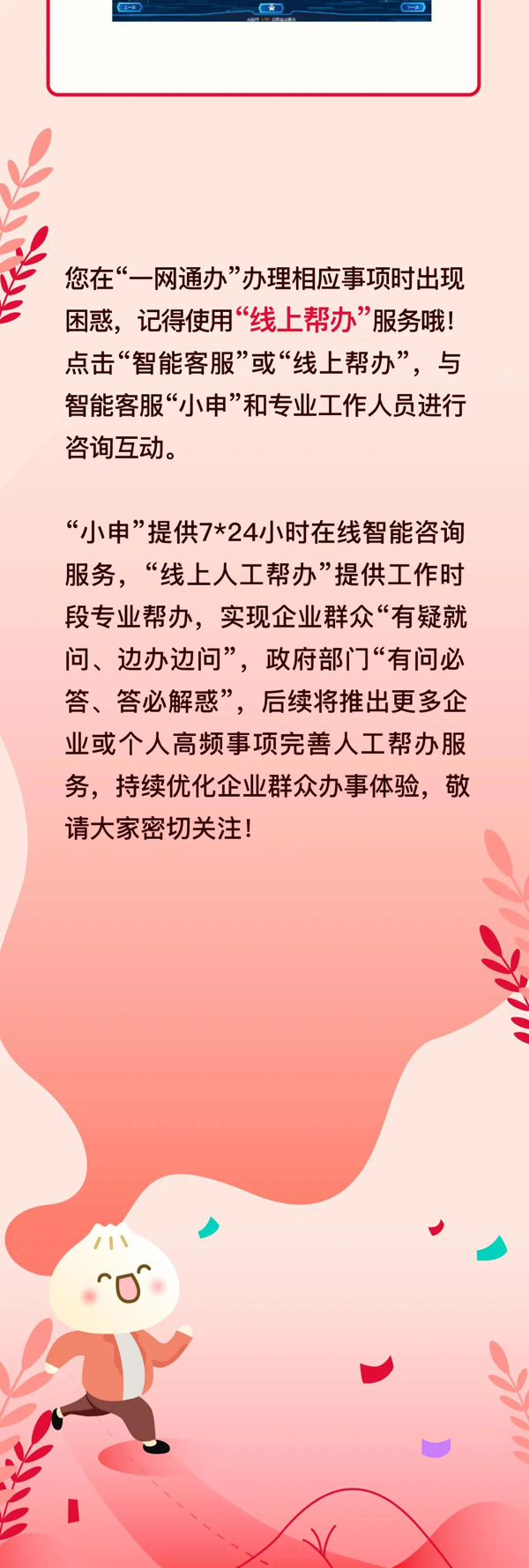 企業(yè)群眾在“一網通辦”平臺網上辦事時,首先通過“小申”進行在線咨詢?!靶∩辍蔽茨芙鉀Q的問題,可以申請“線上人工幫辦”。