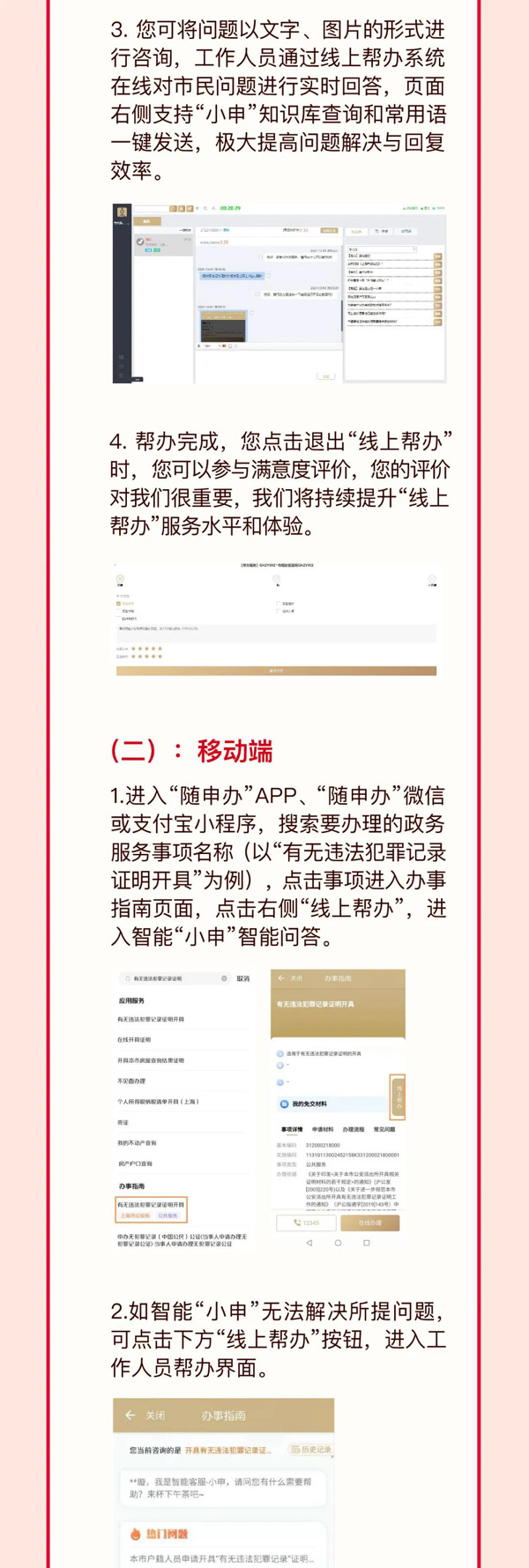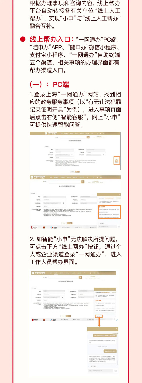 線上幫辦包括三個服務渠道。一是電話咨詢,“12345”市民服務熱線電話和各單位咨詢電話;二是網上“小申”智能客服(以下簡稱“小申”),依托“一網通辦”知識庫提供快速智能問答;三是線上人工專業(yè)幫辦(以下簡稱“線上人工幫辦”),在網上PC端或移動端,通過文字、語音、視頻、截圖、錄音等提供在線交互幫辦服務。