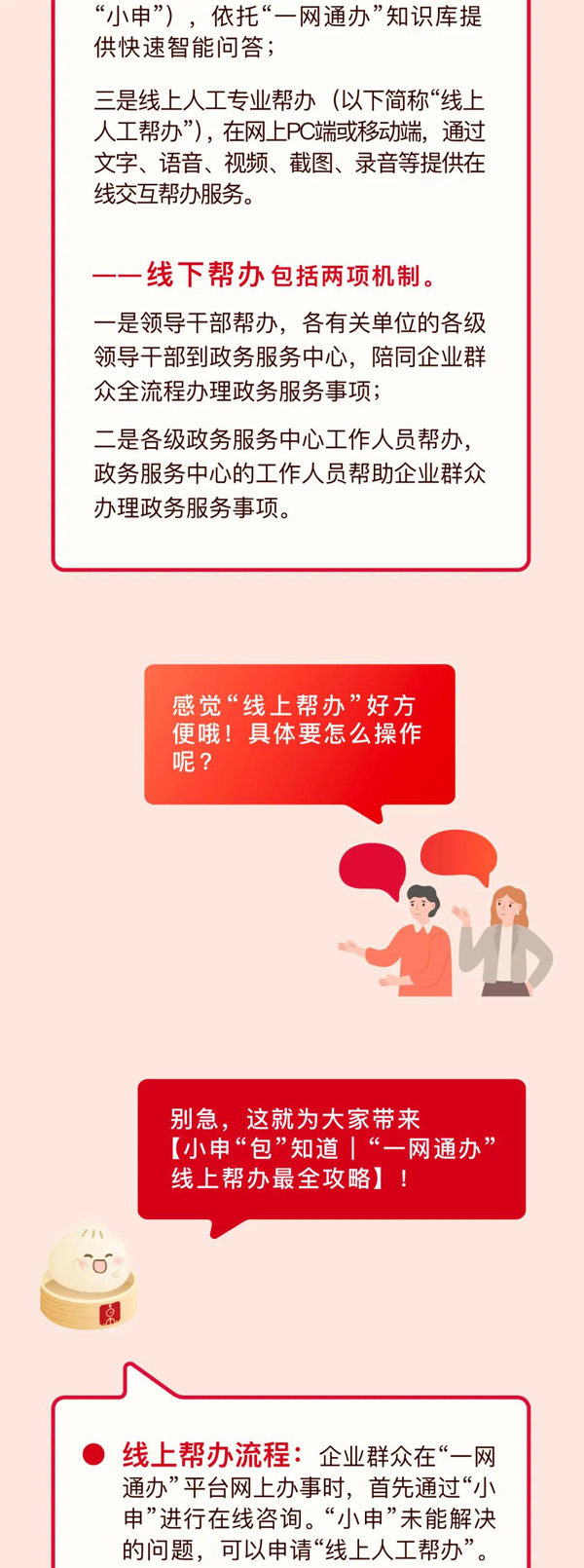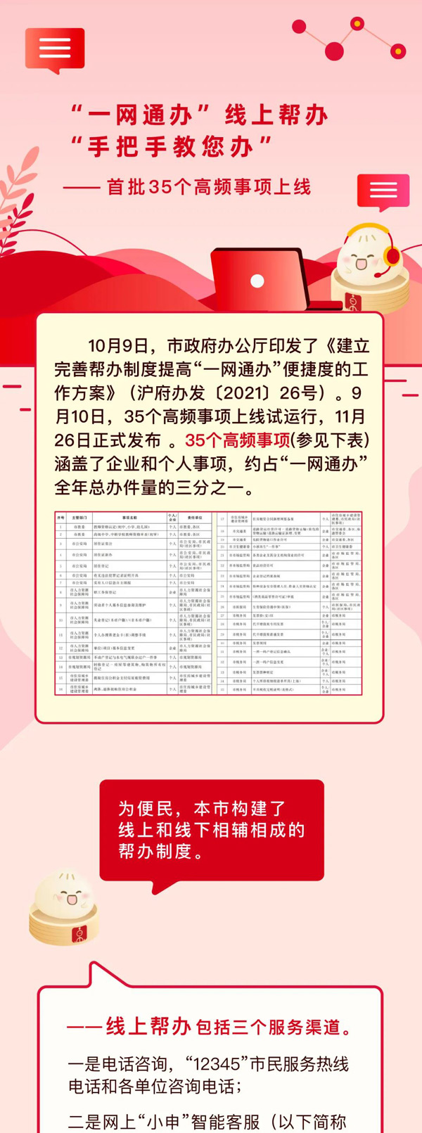 市大數據中心介紹,根據此前印發(fā)的《建立完善幫辦制度提高“一網通辦”便捷度的工作方案》,本市構建線上幫辦和線下幫辦相輔相成的幫辦制度。其中,線上幫辦包括三個服務渠道,線下幫辦包括兩項機制。目前,“線上人工幫辦”35個高頻事項已正式上線,涵蓋企業(yè)和個人事項,年辦件量超2000萬件,約占“一網通辦”全年總辦件量的三分之一。