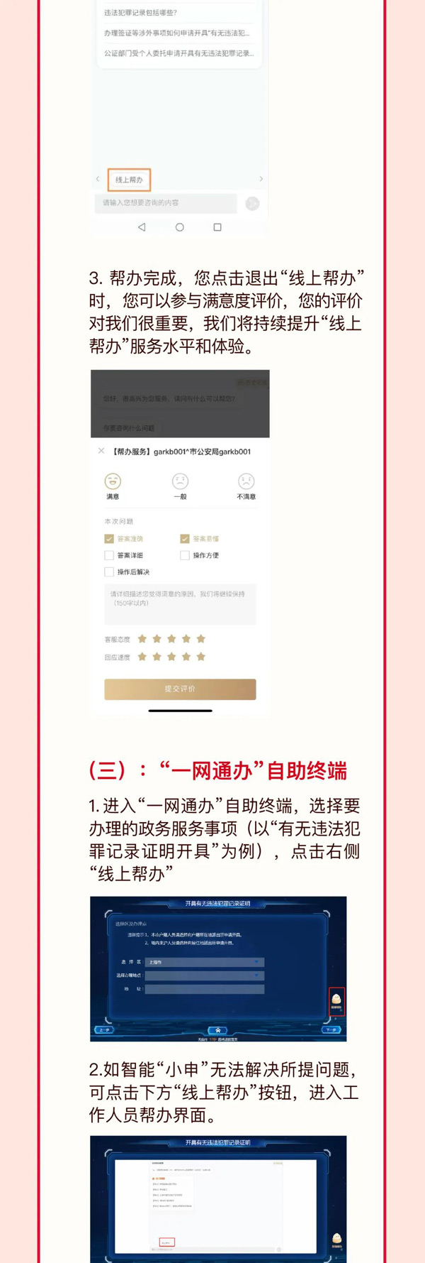線下幫辦包括兩項機制。一是領導干部幫辦,各有關單位的各級領導干部到政務服務中心,陪同企業(yè)群眾全流程辦理政務服務事項;二是各級政務服務中心工作人員幫辦,政務服務中心的工作人員幫助企業(yè)群眾辦理政務服務事項。