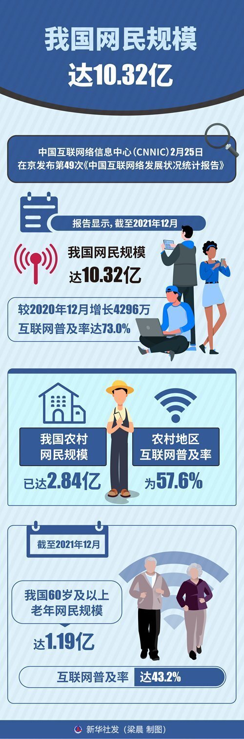 《報(bào)告》顯示,截至2021年12月,我國(guó)網(wǎng)民規(guī)模達(dá)10.32億,較2020年12月增長(zhǎng)4296萬,互聯(lián)網(wǎng)普及率達(dá)73.0%。