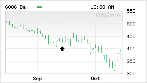 谷歌股價表現(xiàn)圖(箭頭指向處為9月15日當(dāng)天股價表現(xiàn))