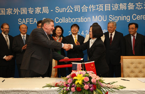 2009年4月21日,Sun Microsystems全球執(zhí)行副總裁兼亞太區(qū)主席Crawford Beveridge先生與中國國家外國專家局(SAFEA)副局長李兵女士代表雙方簽署《面向高校管理者與骨干教師、IT人才,進行素質(zhì)提升與能力建設》合作備忘錄,以支持中國國家人才培養(yǎng)計劃,通過開源技術的力量,促進高校管理者、骨干教師與IT人才、未來技術專家的素質(zhì)提升與能力建設。