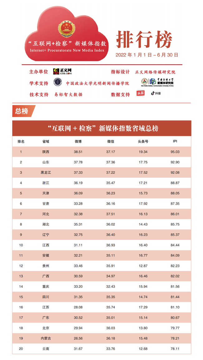 8月3日,2022年上半年“互聯(lián)網(wǎng)+檢察”新媒體指數(shù)排行榜發(fā)布。該榜單評(píng)選由正義網(wǎng)主辦,中國(guó)政法大學(xué)光明新聞傳播學(xué)院、中國(guó)傳媒大學(xué)新媒體研究院提供學(xué)術(shù)支持,正義網(wǎng)絡(luò)傳媒研究院設(shè)計(jì)指標(biāo)體系。