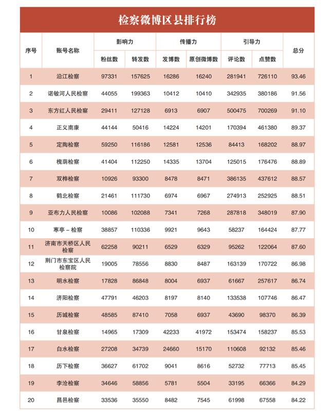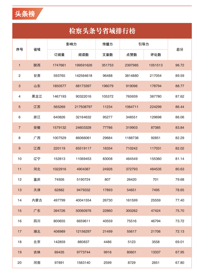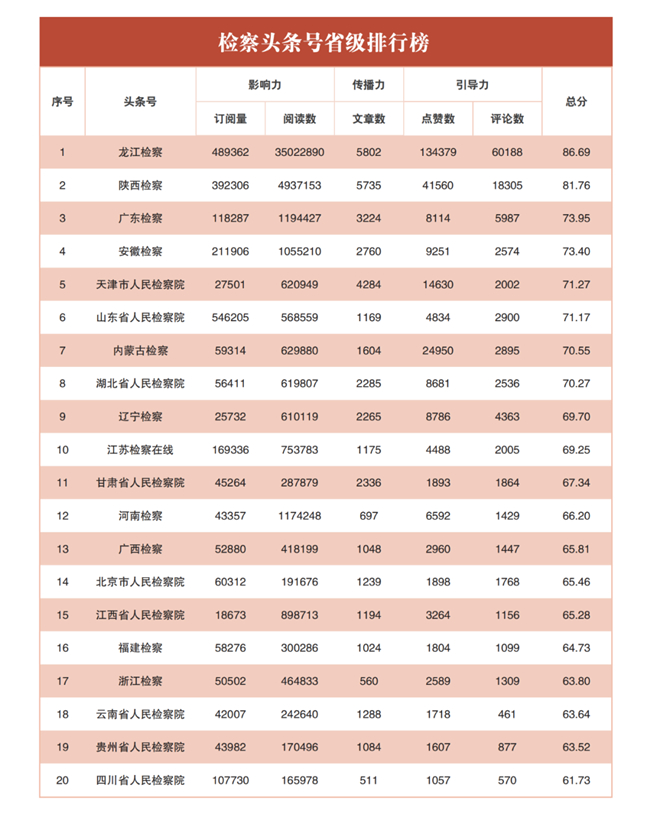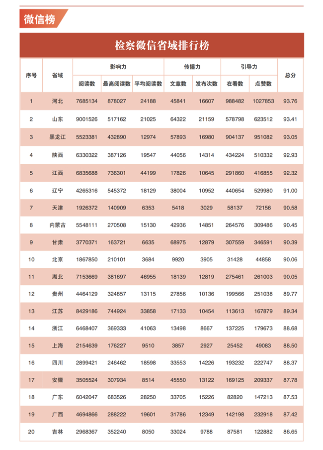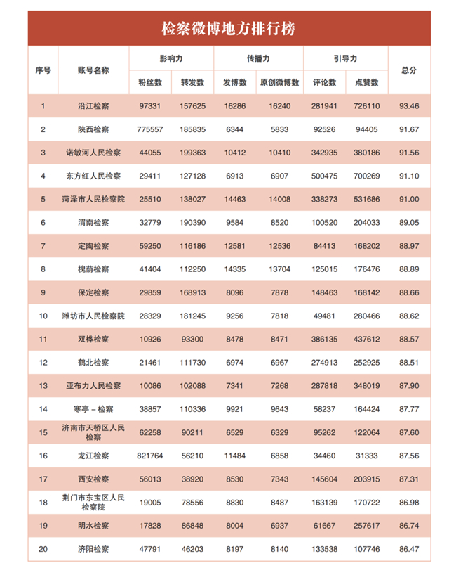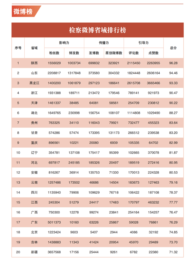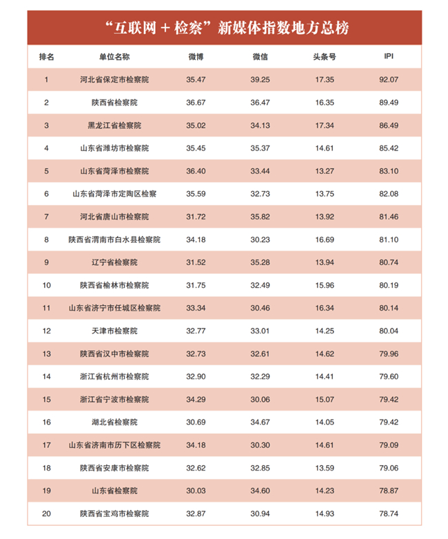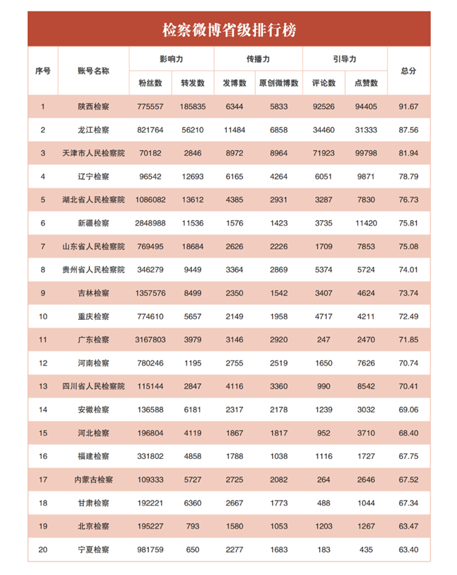 5. “互聯(lián)網(wǎng)+檢察”指數(shù)排行榜由省域榜和地方榜組成。其中,省域榜是以全國(guó)不同省級(jí)行政區(qū)域內(nèi)新媒體各項(xiàng)基礎(chǔ)指標(biāo)的總數(shù)和均值,按照30%、70%的權(quán)重運(yùn)算得出。地方榜則是以每個(gè)檢察機(jī)關(guān)新媒體各項(xiàng)基礎(chǔ)指標(biāo)加權(quán)運(yùn)算得出。