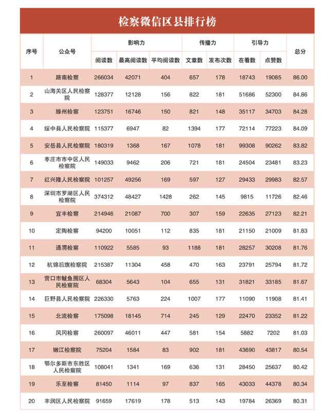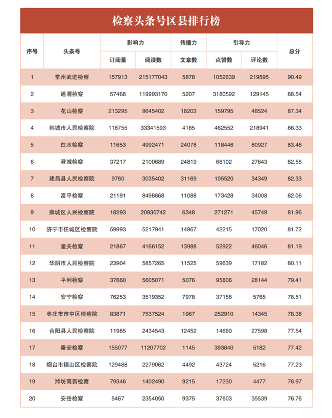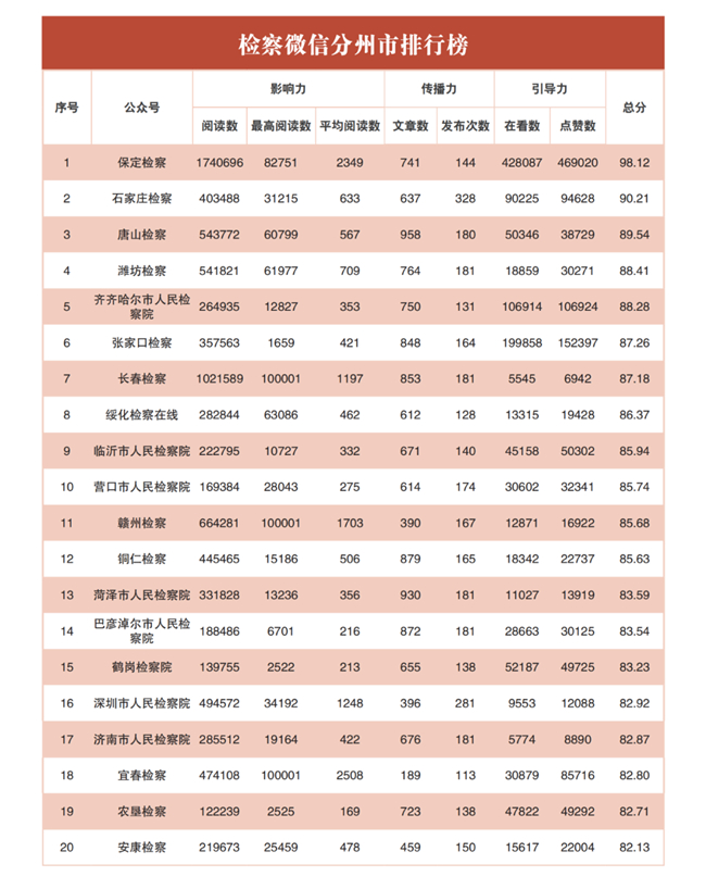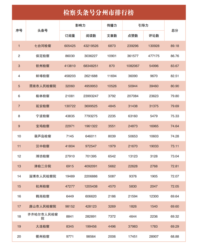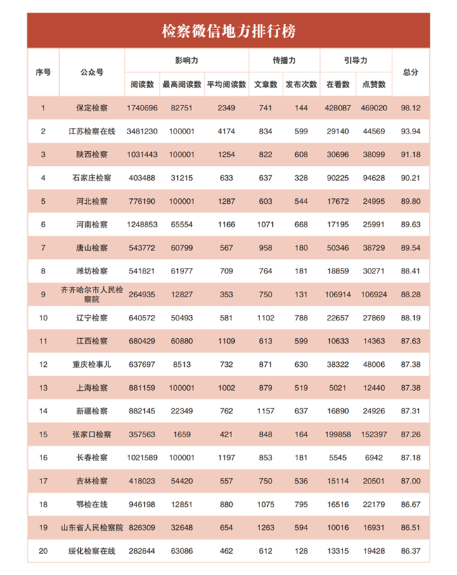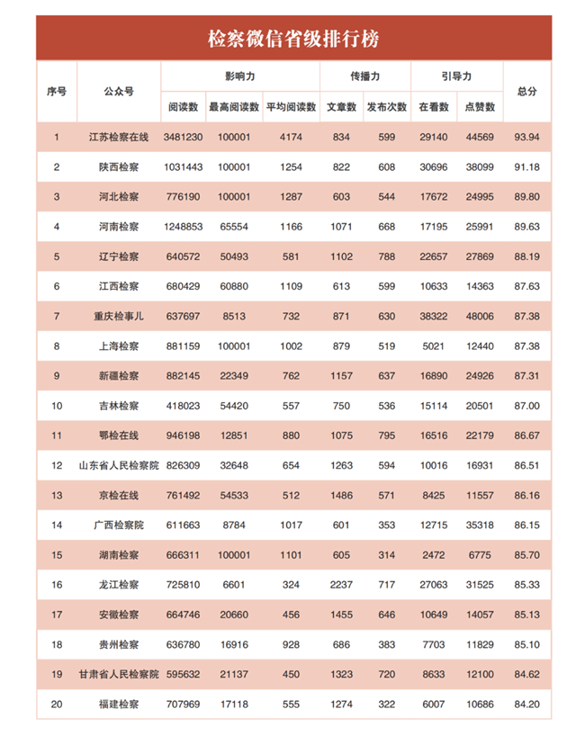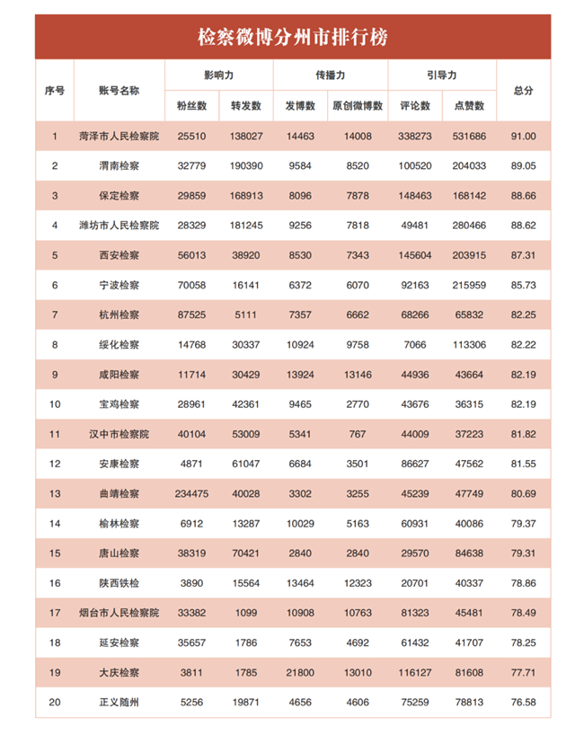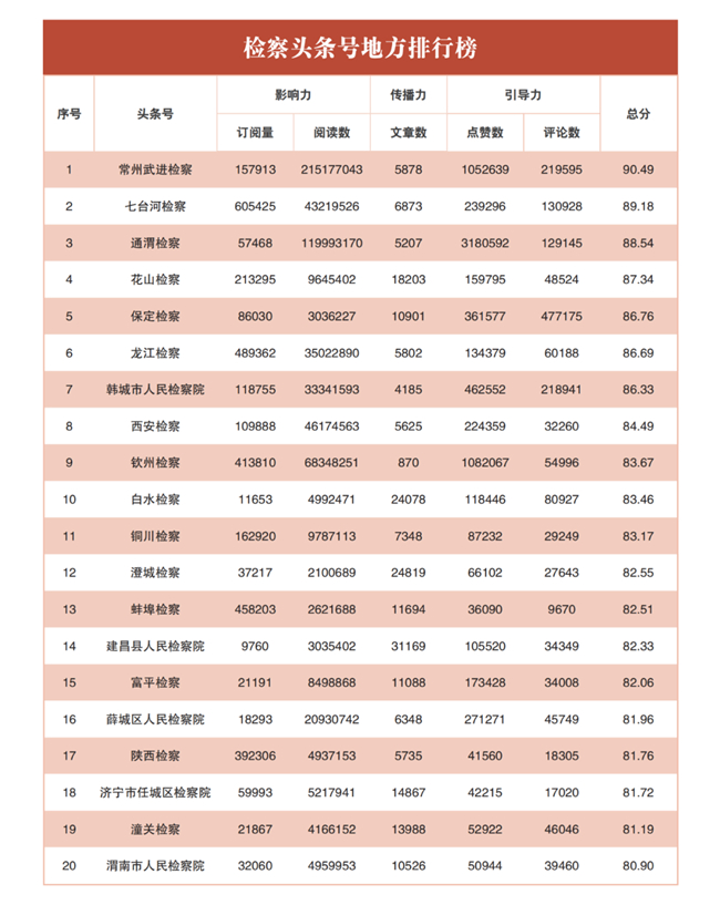 5. “互聯(lián)網(wǎng)+檢察”指數(shù)排行榜由省域榜和地方榜組成。其中,省域榜是以全國(guó)不同省級(jí)行政區(qū)域內(nèi)新媒體各項(xiàng)基礎(chǔ)指標(biāo)的總數(shù)和均值,按照30%、70%的權(quán)重運(yùn)算得出。地方榜則是以每個(gè)檢察機(jī)關(guān)新媒體各項(xiàng)基礎(chǔ)指標(biāo)加權(quán)運(yùn)算得出。