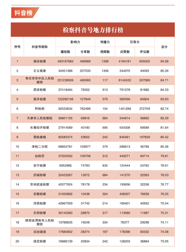 地方榜中,河北省保定市檢察院、陜西省檢察院、黑龍江省檢察院位居總榜前三。黑龍江省沿江檢察院榮獲微博榜冠軍,河北省保定市檢察院位列微信榜首位,江蘇省常州市武進(jìn)區(qū)檢察院位居頭條榜首位。地方微博榜中,陜西省檢察院、山東省菏澤市檢察院、黑龍江省沿江檢察院分別占據(jù)省級(jí)榜、分州市榜、區(qū)縣榜榜首。地方微信榜中,江蘇省檢察院、河北省保定市檢察院、河北省唐山市路南區(qū)檢察院分別位居三級(jí)榜首位。地方頭條榜中,黑龍江省檢察院、黑龍江省七臺(tái)河市檢察院、江蘇省常州市武進(jìn)區(qū)檢察院分別奪得三級(jí)榜冠軍。地方抖音榜中,廣東省潮州市潮安區(qū)檢察院、江西省贛州市南康區(qū)檢察院、山東省棗莊市市中區(qū)檢察院躋身前三。