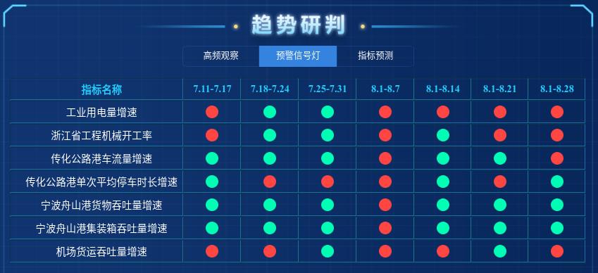 三是預(yù)警更直觀:智能分析高頻數(shù)據(jù)周增速環(huán)比變化情況,以紅、藍(lán)、綠三色信號(hào)燈形式展示經(jīng)濟(jì)運(yùn)行情況,及時(shí)發(fā)現(xiàn)經(jīng)濟(jì)運(yùn)行苗頭性、傾向性、趨勢(shì)性問題。