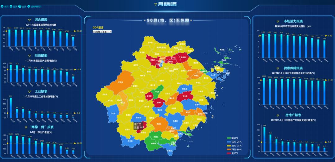 四是晾曬更有效:圍繞浙江穩(wěn)進(jìn)提質(zhì)八大攻堅(jiān)行動(dòng),構(gòu)建指標(biāo)體系,共7張報(bào)表28項(xiàng)指標(biāo),每月以柱狀圖和“五色圖”綜合晾曬全省11市、90縣(市、區(qū)),便于各地查漏補(bǔ)缺,推動(dòng)全省形成爭(zhēng)先創(chuàng)優(yōu)的氛圍。