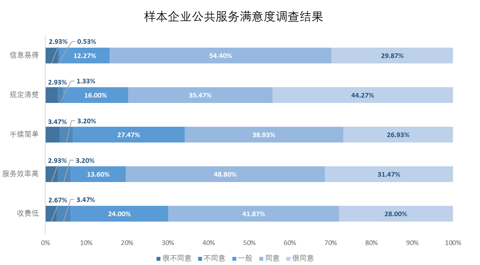 樣本企業(yè)對上海公共服務(wù)的平均滿意百分比為78.6%,其中選擇“滿意”和“很滿意”的比例從高到低為84.27%(信息易得)、80.27%(服務(wù)效率)、79.74%(規(guī)定清晰)、69.87%(費用水平)和65.86%(手續(xù)簡單)。