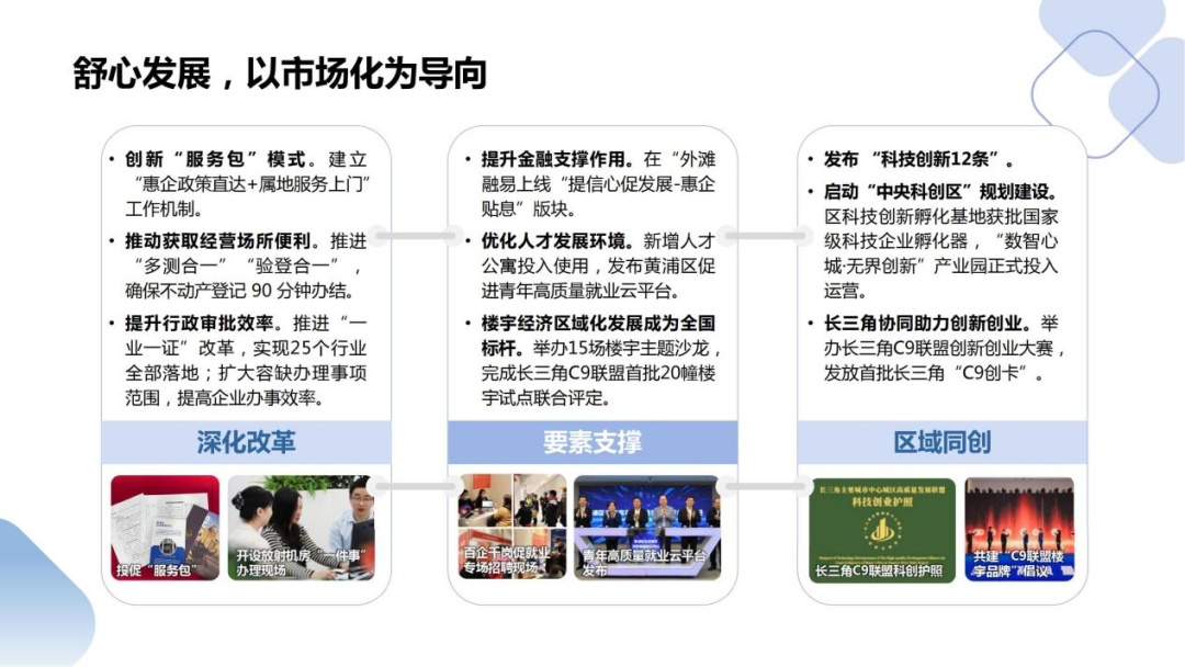 以市場(chǎng)化為導(dǎo)向,深化改革、鞏固要素支撐、探索區(qū)域同創(chuàng)。如創(chuàng)新“服務(wù)包”模式,變“企業(yè)找政策”為“政策找企業(yè)”;推進(jìn)“多測(cè)合一”“驗(yàn)登合一”,確保不動(dòng)產(chǎn)登記90分鐘辦結(jié);發(fā)放首批長(zhǎng)三角“C9創(chuàng)卡”,提供跨區(qū)域融資對(duì)接、場(chǎng)地孵化等服務(wù)。