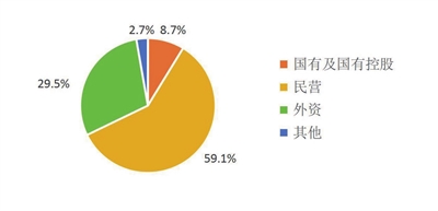 從企業(yè)類型看,民營企業(yè)占比59.1%,外資企業(yè)占比29.5%,國有及國有控股企業(yè)(以下簡稱國有企業(yè))占比8.7%,其他所有制企業(yè)占比2.7%(如圖1)。
