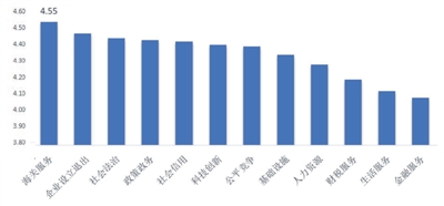 《報(bào)告》的評價指標(biāo)體系由12個一級指標(biāo)和55個二級指標(biāo)組成。12個一級指標(biāo)包括基礎(chǔ)設(shè)施、生活服務(wù)、政策政務(wù)、社會信用、公平競爭、社會法治、科技創(chuàng)新、人力資源、金融服務(wù)、財(cái)稅服務(wù)、海關(guān)服務(wù)以及企業(yè)設(shè)立退出,評價指標(biāo)取值范圍為1分至5分。受訪企業(yè)對海關(guān)服務(wù)、企業(yè)設(shè)立退出、社會法治及政策政務(wù)等指標(biāo)給予了較高評價,其中對海關(guān)服務(wù)指標(biāo)的評價最高,達(dá)到4.55分,位于“優(yōu)秀”區(qū)間(如圖5)。