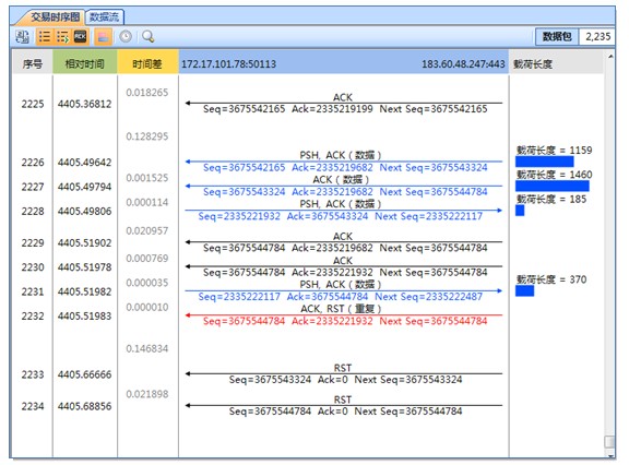 在PC端發(fā)現(xiàn)QQ掉線后,大約1秒就自動(dòng)恢復(fù)連接。而平時(shí)因網(wǎng)絡(luò)丟包或時(shí)延大而導(dǎo)致的掉線,會(huì)等若干秒才能連上。用科來網(wǎng)絡(luò)分析系統(tǒng)進(jìn)行分析,發(fā)現(xiàn)掉線是由QQ服務(wù)器Reset TCP連接導(dǎo)致的。這也就能解釋為何掉線后能立即連上。抓包截圖如下: