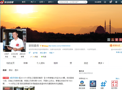 在網(wǎng)絡(luò)上找到歐陽(yáng)后增并不難,只要在搜索頁(yè)面輸入“歐陽(yáng)委員”,便會(huì)出現(xiàn)一系列網(wǎng)頁(yè)鏈接,首先進(jìn)入眼簾的就是新浪微博。進(jìn)入他的新浪微博主頁(yè),記者被他的簡(jiǎn)介所吸引:省政府參事咨詢協(xié)會(huì)宣傳部副部長(zhǎng)、溫州市政協(xié)委員、社情民意信息員、五型機(jī)關(guān)督查員、十佳市民監(jiān)督員、媒體特約評(píng)論員……人稱“提案大王”。身居多職、擁有十幾萬(wàn)粉絲的他,跟記者分享了他對(duì)微博問政的一些看法。