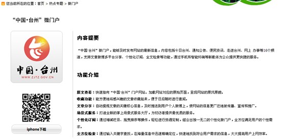 2013年,“中國(guó)·臺(tái)州”微門戶打造了智慧政府和電子政務(wù)云計(jì)算的創(chuàng)新典型,為市民提供最有用、最快捷、最方便的政府服務(wù),并成為市民隨身攜帶的政府服務(wù)手冊(cè)。這款應(yīng)用支持IPHONE、IPAD、Android等操作系統(tǒng)的各類移動(dòng)終端。還支持微博推送分享、文章收藏、個(gè)性化訂閱、全文檢索等功能,為公眾提供更快捷的服務(wù)。此外,微門戶還支持微博推送分享、文章收藏、個(gè)性化訂閱、全文檢索等功能,為公眾提供更快捷的服務(wù)。為此,大會(huì)為“中國(guó)·臺(tái)州”門戶網(wǎng)站頒發(fā)了應(yīng)用創(chuàng)新獎(jiǎng)。