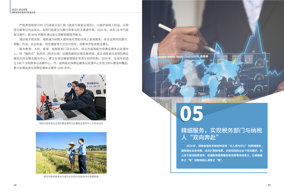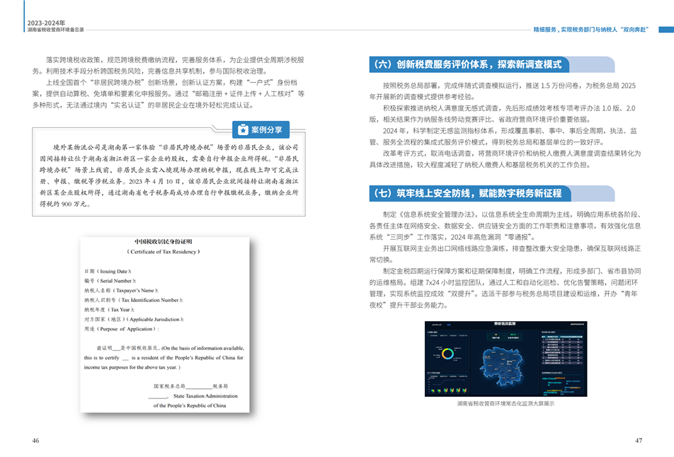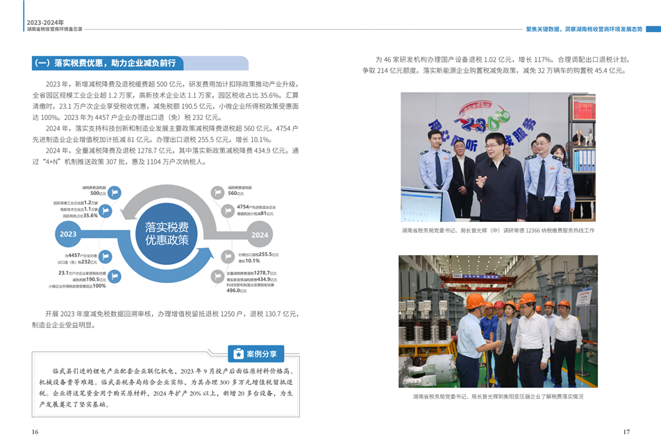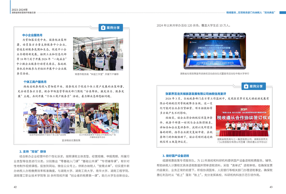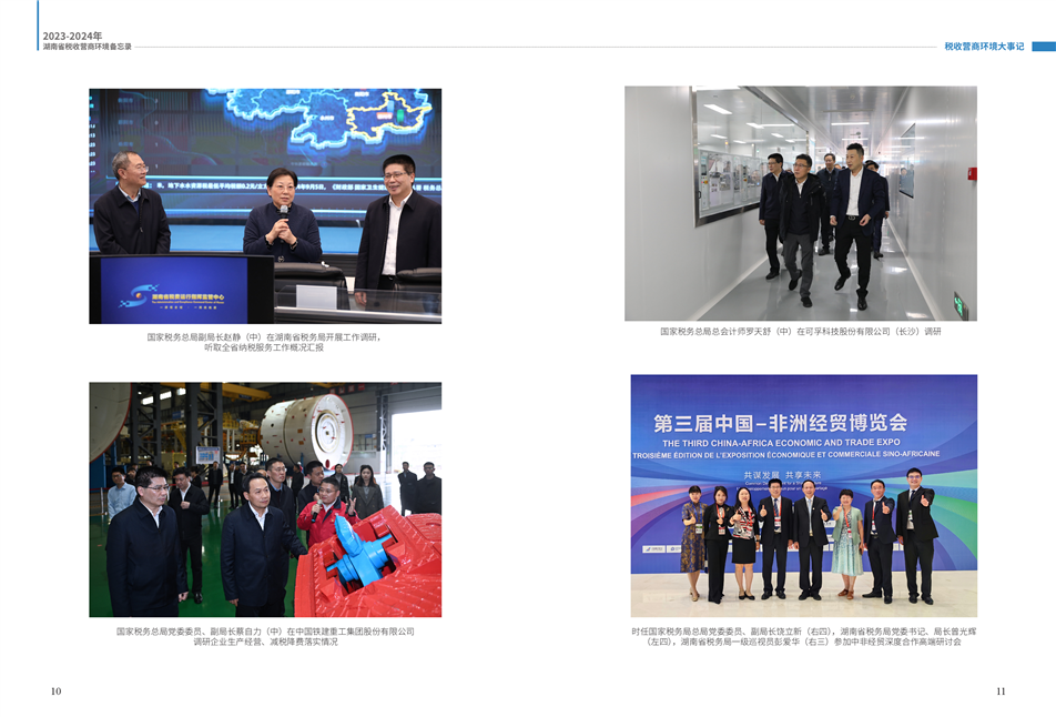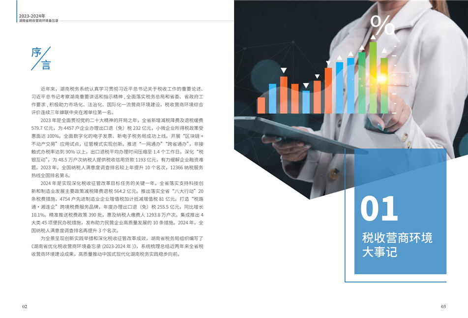 為更好展示湖南稅務(wù)部門在優(yōu)化營商環(huán)境工作中的創(chuàng)新舉措和改革成效,湖南省稅務(wù)局組織編寫了《2023—2024年湖南省稅收營商環(huán)境備忘錄》。全書共分為9個(gè)篇章,以“四個(gè)聚焦”鋪展呈現(xiàn):