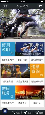 2013年年末,“平安瀘州”微信通過(guò)學(xué)習(xí)沿海和其它省級(jí)公安微信平臺(tái)的運(yùn)維模式,提出“以功能開發(fā)為契機(jī),增加服務(wù)范圍,提高便民效率”的思路,增設(shè)“公安業(yè)務(wù)辦事指南”、“瀘州本地車輛交通違法記錄查詢”功能,有效整合內(nèi)部資源,充分實(shí)現(xiàn)“便民利民”。通過(guò)后臺(tái)開發(fā),現(xiàn)在“平安瀘州”官方微信公眾平臺(tái)升級(jí)為“微網(wǎng)站”。首頁(yè)包含圖文、視頻等按鈕,以“瀘州公安業(yè)務(wù)辦事大廳”出現(xiàn),囊括治安(戶政)、消防、車輛管理、出入境等7個(gè)警種118項(xiàng)業(yè)務(wù)咨詢和交通違法查詢業(yè)務(wù)模塊,操作簡(jiǎn)便,一目了然。“平安瀘州”微信平臺(tái)“本地車輛交通違法記錄查詢系統(tǒng)”,是瀘州本地最準(zhǔn)確、最及時(shí)的本地車輛交通違法記錄查詢平臺(tái),同時(shí)也是全省公安機(jī)關(guān)唯一一個(gè)具備后臺(tái)開發(fā)的公安微信公眾平臺(tái),其采用“微網(wǎng)站”的形式上線,從美觀和實(shí)用性上,大大超越了普通的微信公眾平臺(tái),這在全國(guó)公安微信公眾平臺(tái)中,也不多見(jiàn)。