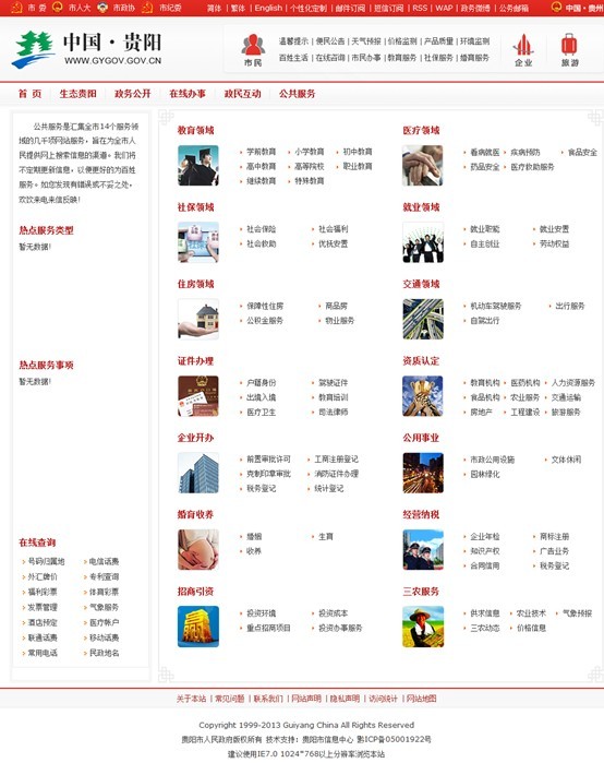 貴陽市政府門戶網(wǎng)站采用以服務對象、網(wǎng)站功能相結合的多維度方式進行規(guī)劃和設計。頻道按照用戶對象分為政務、企業(yè)、市民、旅游;同時欄目按照政務信息、網(wǎng)上辦事、互動交流等網(wǎng)站功能的相關文件以及電子政務發(fā)展趨勢要求和民生服務需求設立欄目,凸顯國內(nèi)一流政府網(wǎng)站的建設理念。