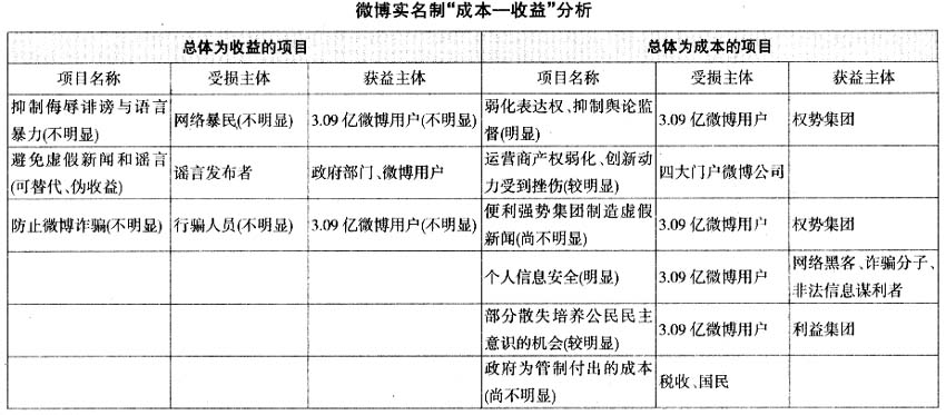 雖然3.09億微博用戶具有微博實(shí)名制收益項(xiàng)目的主體資格,但是收益效果不明顯,避免虛假新聞和謠言的受益主體主要是政府部門和微博用戶,但是屬于“偽收益”項(xiàng)目;而為微博實(shí)名制付出成本的受損主體主要是數(shù)億微博用戶,還有繳稅的全體國(guó)民,成本付出的受益主體主要是權(quán)勢(shì)集團(tuán)和利益集團(tuán)。所以總體上,3.09億微博用戶為微博實(shí)名制付出的成本最多,獲益卻不明顯。而強(qiáng)勢(shì)集團(tuán)和利益集團(tuán)卻在成本付出的多項(xiàng)項(xiàng)目中獲得明顯或較明顯的收益,因而總體上微博實(shí)名制是一項(xiàng)傾向于較多考慮權(quán)勢(shì)集團(tuán)利益的規(guī)制。