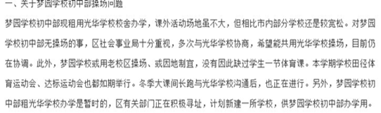 這則留言最后將矛頭指向高新區(qū)對(duì)于教育投入的不足,并根據(jù)《中華人民共和國義務(wù)教育法》指出高新區(qū)管委會(huì)在學(xué)校規(guī)劃和設(shè)置事項(xiàng)上的不作為。2月17日,高新區(qū)工委辦公室在網(wǎng)上回復(fù),表示由管委會(huì)出資租用光華學(xué)校操場(chǎng)用于夢(mèng)園學(xué)校辦學(xué)。