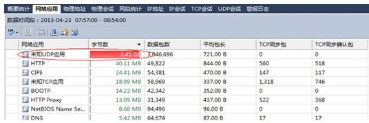 對于流量突發(fā)造成網(wǎng)絡(luò)擁塞,我們需要弄清楚在流量突發(fā)時具體業(yè)務(wù)應(yīng)用。通過回溯分析,選擇流量峰值23日8:00-9:00之間的通訊數(shù)據(jù),網(wǎng)絡(luò)應(yīng)用流量分布如下圖所示: