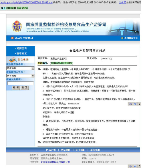 首先,我看這個作為消費者投訴的信息已經(jīng)很夠詳細了。時間(6月初),地點(湖南省兒童醫(yī)院),人物(嬰兒!),事件(腎結(jié)石),甚至用了實名(翟先生)。三鹿這個品牌的名也點了。我不大明白,在網(wǎng)站上做回復(fù)的公務(wù)員還希望這些父母提供什么詳細信息?不會要求他們提供檢測報告啥的吧?需知專業(yè)的三鹿自己測了半天還報告說沒問題,更專業(yè)的衛(wèi)生部也檢測了好一陣子,普通消費者還要怎么做?
