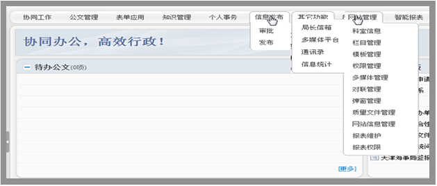 ?。?)內(nèi)部網(wǎng)站一體化集成:內(nèi)部網(wǎng)站管理功能均以菜單的方式集成在協(xié)同平臺,實(shí)現(xiàn)了信息審批及信息推送位置的自動(dòng)性