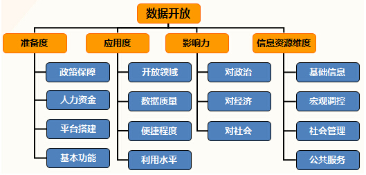 隨著大數(shù)據(jù)時代的來臨,數(shù)據(jù)開放將作為未來政府網(wǎng)站建設的重中之重,包括準備度、應用度、影響力三個要素;此外,考慮到信息資源的維度,圍繞政府部門四項基本職能,也需從基礎信息、宏觀調控、社會管理、公共服務四個方面對數(shù)據(jù)開放進行考評。