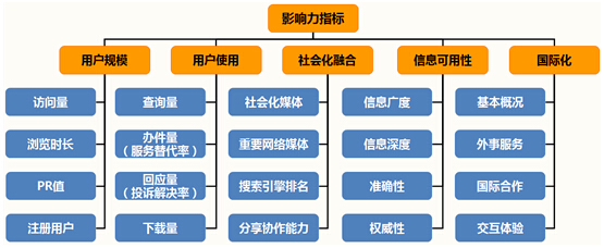 影響力是衡量政府網(wǎng)站對政府形象塑造、政府工作績效支撐度的重要指標,圍繞用戶的視角、生態(tài)的視角、權威的視角、國際的視角,其考評維度可以從“用戶規(guī)模、用戶使用、社會化融合、信息可用性、國際化”5個方面來展開。