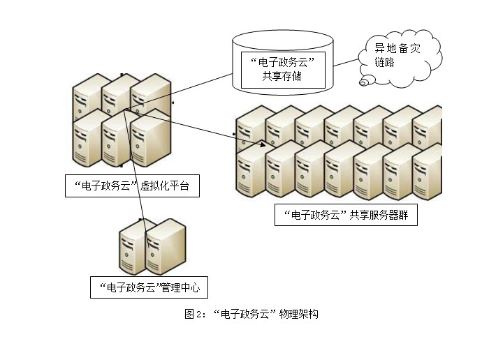 “電子政務(wù)云”的物理架構(gòu)由云共享服務(wù)器群、云管理中心、云虛擬化平臺、云共享存儲設(shè)備和云異地備災(zāi)鏈接五部分組成。共享服務(wù)器群和共享存儲設(shè)備組成“電子政務(wù)云”的硬件基礎(chǔ)平臺。云虛擬化平臺和云管理中心分別是在硬件平臺上構(gòu)建的虛擬計算機系統(tǒng)和系統(tǒng)管理平臺。異地備災(zāi)鏈接是“電子政務(wù)云”和兄弟“電子政務(wù)云”的鏈接接口,每天進行同步備份,用于本地服務(wù)器群遭遇毀滅性打擊時的數(shù)據(jù)恢復(fù)。