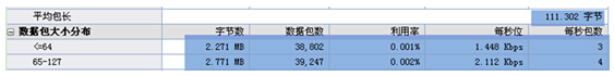 上圖也反映了一些特征,我們看到,抓包網(wǎng)絡(luò)內(nèi)的數(shù)據(jù)包長只有111.3Byte,這個平均包長是偏小的,而且數(shù)據(jù)包大小分析發(fā)現(xiàn)<=64字節(jié)和65-127字節(jié)之間的數(shù)據(jù)占了絕大多少,這就充分說明了網(wǎng)絡(luò)中有大量的小包存在。