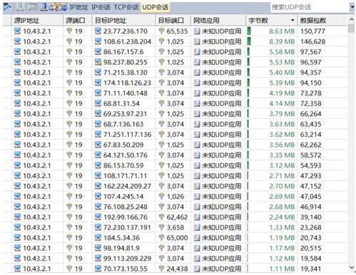 通過對這段時間網(wǎng)絡應用和通訊會話的數(shù)據(jù)挖掘,我們發(fā)現(xiàn)出口鏈路被一臺內(nèi)網(wǎng)服務器10.42.2.1大量發(fā)送的UDP包所阻塞,這一臺主機發(fā)送流量的速率就達到了互聯(lián)網(wǎng)出口帶寬的7倍。
