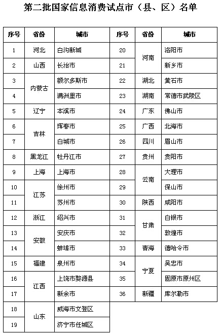 據(jù)悉,2013年12月工信部公示了首批68個國家信息消費試點市(縣、區(qū))。