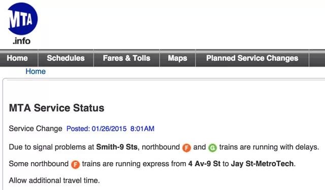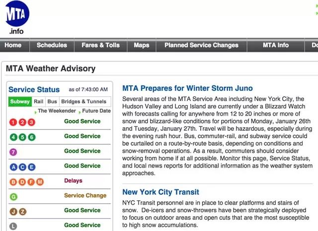 假設你是一個紐約市民,早上起來看到暴風雪,想知道自己上班坐的地鐵和公交車是不是還在正常運行,那么你可以點開交通管理部門“大都會運輸署”的網(wǎng)站。這個網(wǎng)站略顯簡陋,但是在首頁一眼就能看到地鐵、公交車、鐵路、橋梁和隧道的運行狀況。