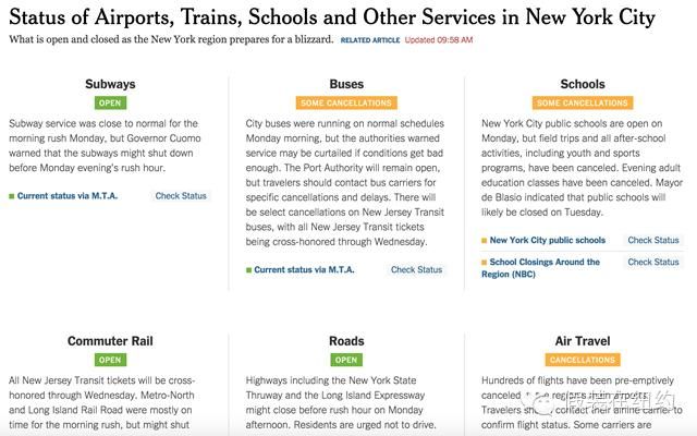 不過我今天要說的并不是這場雪,而是在《紐約時報》網(wǎng)站上看到的這個頁面,上面列出了各個政府管理部門的專門網(wǎng)頁,點進去就能看到各種公共服務的實時狀態(tài)更新。