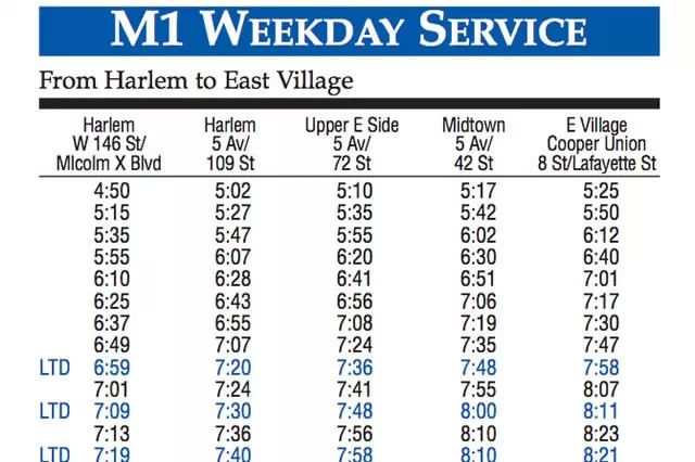 當然,這個網(wǎng)站提供的不止是延誤信息,你還可以在上面查到每一班地鐵和每一路公交車每天到達每一個站的時間。比如,下面就是M1路公交車的運行時刻表。