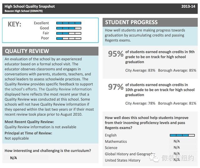 我們點開其中的一所學校,燈塔高中(Beacon High School)的頁面,上面除了各種基本信息、介紹和聯(lián)系方式以外,最重要的,仍然是一份PDF文檔,上面詳細載明了這個學校在上一學年的各項統(tǒng)計數(shù)據(jù),非常詳盡。比如燈塔高中的統(tǒng)計報告上就可以看到,該校上一學年95%的9年級學生成績合格,而同期全市的平均合格率是83%,該校所在的布魯克林區(qū)的平均合格率則是85%。當然,每一所學校都一定會有這樣一份統(tǒng)計數(shù)據(jù)??上攵獙τ趯W生家長來說,這些數(shù)據(jù)是多么重要。