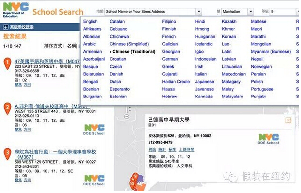 查完警察局,我們再來看看教育局(Department of Education, 簡稱DOE)的情況。不出意外地,教育局的網(wǎng)站上可以方便地查到所有的學校,并且可以根據(jù)地址、區(qū)域、年級等多個條件進行檢索,而且還提供了91種語言的翻譯(這個也是沒辦法,紐約就是有這么多種族和國家的人?。?/div>