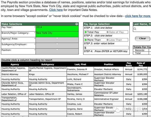 毫不夸張地說,在美國這個國家,所有的信息都是透明的。普通人想查詢?nèi)魏喂彩聞辗矫娴臄?shù)據(jù),都可以非常方便地查到。比如政府部門每一個工作人員每一年的薪酬狀況。在下面這個網(wǎng)站上,我查到了房屋局的電梯維修工Luis Cevallos的日薪是350美元,而勞動關(guān)系處處長James Hanley在2014年的年薪則是205180美元。