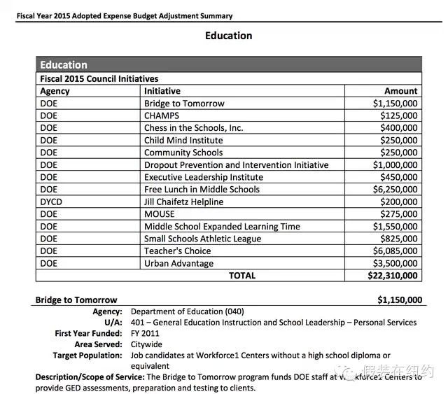 最讓人嘆為觀止的還是預算。通過搜索,我?guī)缀醪毁M吹灰之力地查到了紐約市議會網(wǎng)站上公布的2015財年的預算,這是一個有292頁的巨大文檔,上面巨細無遺地列舉了分配給每一個市議員、每一個民間機構(gòu)的每一筆錢,以及這筆錢的金額和用途。比如我看到一個叫做“韓裔美國人家庭服務中心”的非營利組織就申請到了3900美元,這筆錢用于雇傭能說韓語和懂韓國文化的工作人員,為韓裔家庭暴力受害者提供幫助,協(xié)助申請到這筆錢的是市議員Daniel Dromm。在這個文檔里,這樣的條目大概有成千上萬,小到幾百、幾千美元,多到幾萬幾十萬美元,每一筆預算都能像這樣找到出處。